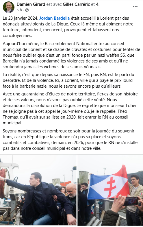 Dans une publication odieuse sur les réseaux sociaux, illustrée par des photos soigneusement et délibérément choisies, le député de la 5ème circonscription du Morbihan Damien Girard assimile et lie le Rassemblement National au groupuscule identitaire néonazi « la Digue » ainsi qu’à ses agissements violents. Il encourage également, sans beaucoup de subtilité, à venir « bordéliser » le Conseil Municipal de Lorient pour « accueillir » Théo Thomas, le nouvel élu lorientais du camp national.